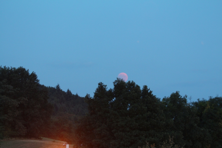 erzeugt wird, und bekommt dabei seine typisch rote Farbe. Beding durch Hügel und Dunst konnte ich den ersten Blick auf den Mond erst gegen 22 Uhr werfen, als er schon im Kernschatten eingetaucht war. Hier nun einige Aufnahmen des Verlaufes: Uhrzeit: 22:01, CANON 650D, f=400mm Brennweite, 800 ASA Uhrzeit: 23:01, CANON 650D, f=400mm Brennweite, 800 ASA Uhrzeit: 23:17, CANON 650D, f=100mm Brennweite, 800 ASA Uhrzeit: 00:10, CANON 650D, f=400mm Brennweite, 800 ASA |